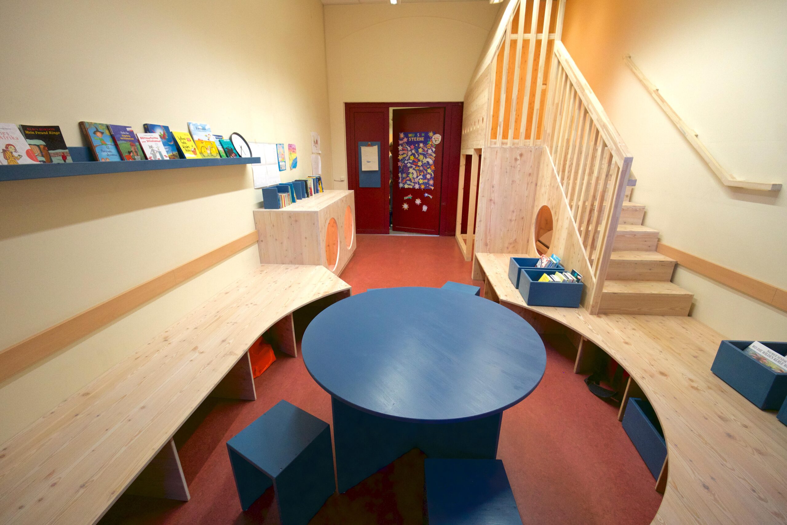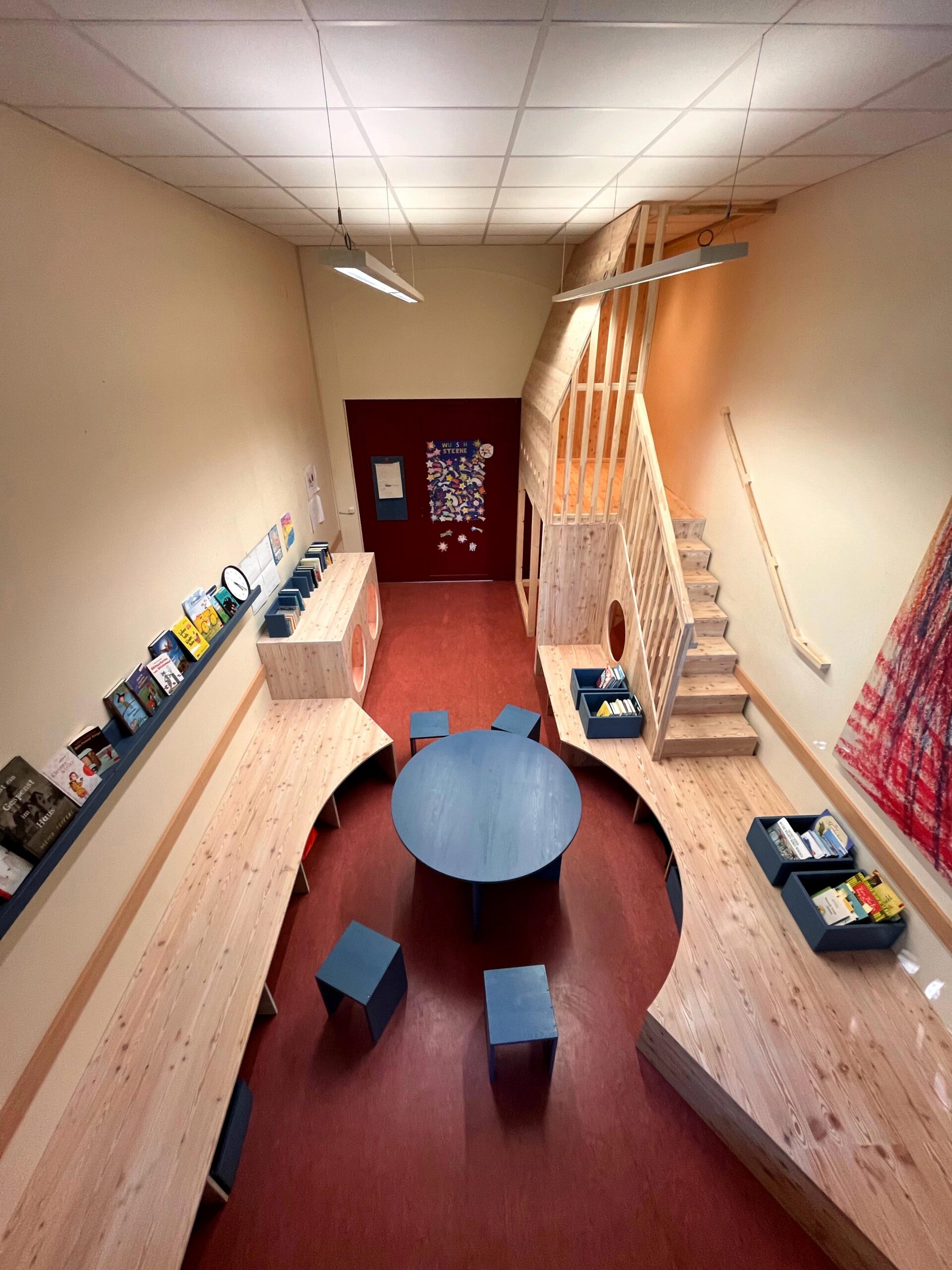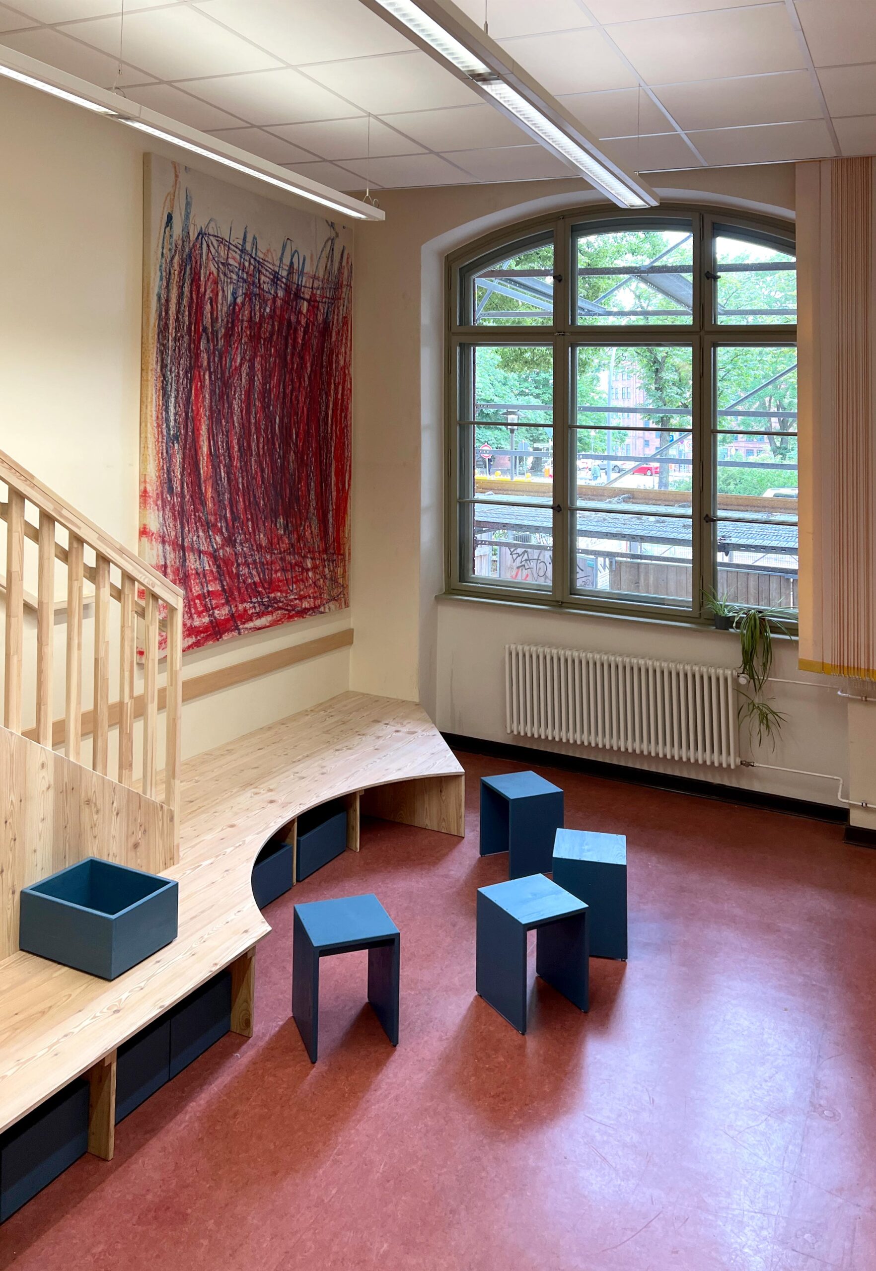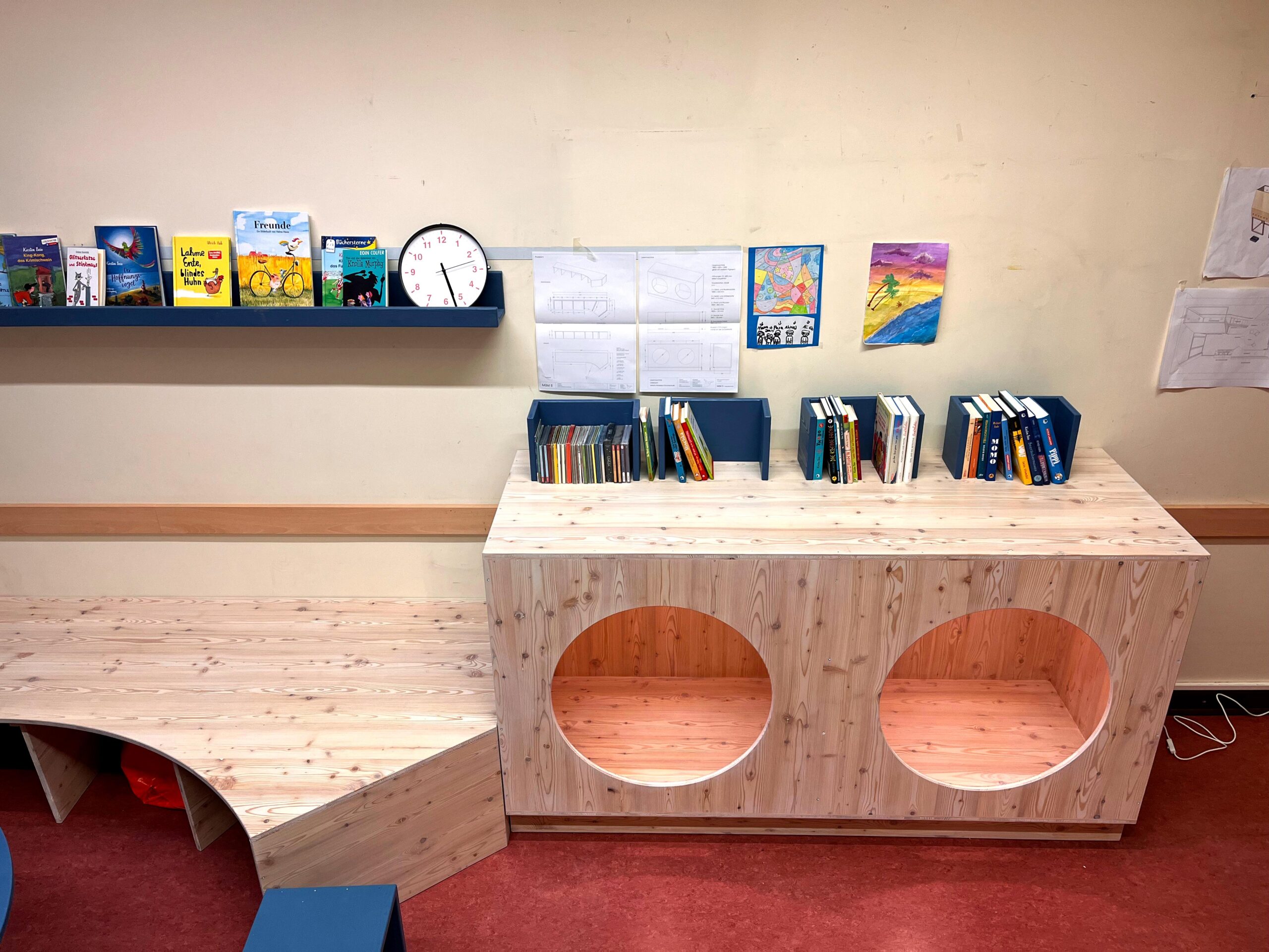 Die Gestaltung des Leseraumes ist ein Ergebnis der gemeinsamen Kräfte von Schulleitung, Bezirksamt Berlin-Mitte, Schülervertreter:innen der Miriam-Makeba-Grundschule und Bauereignis.