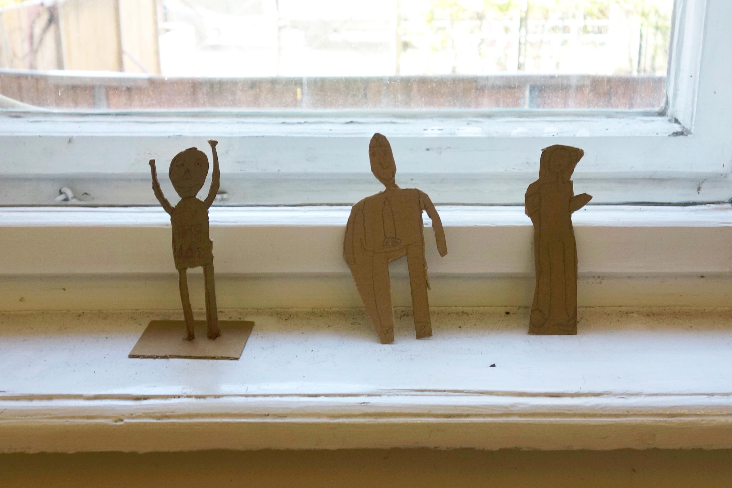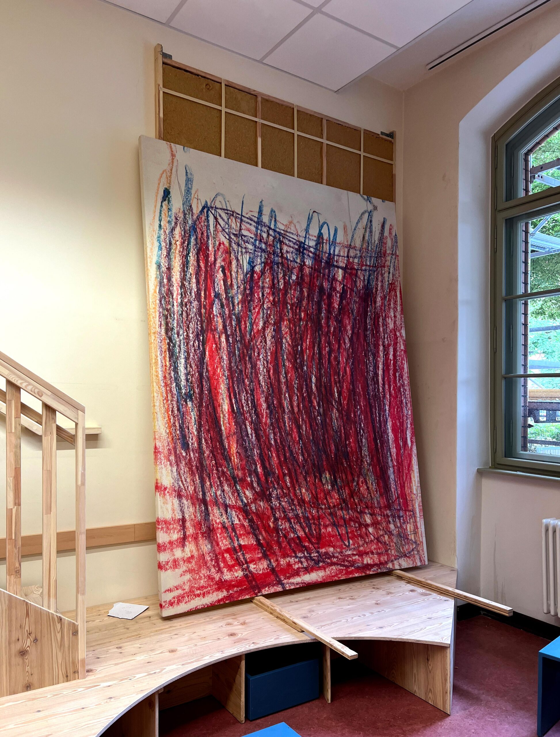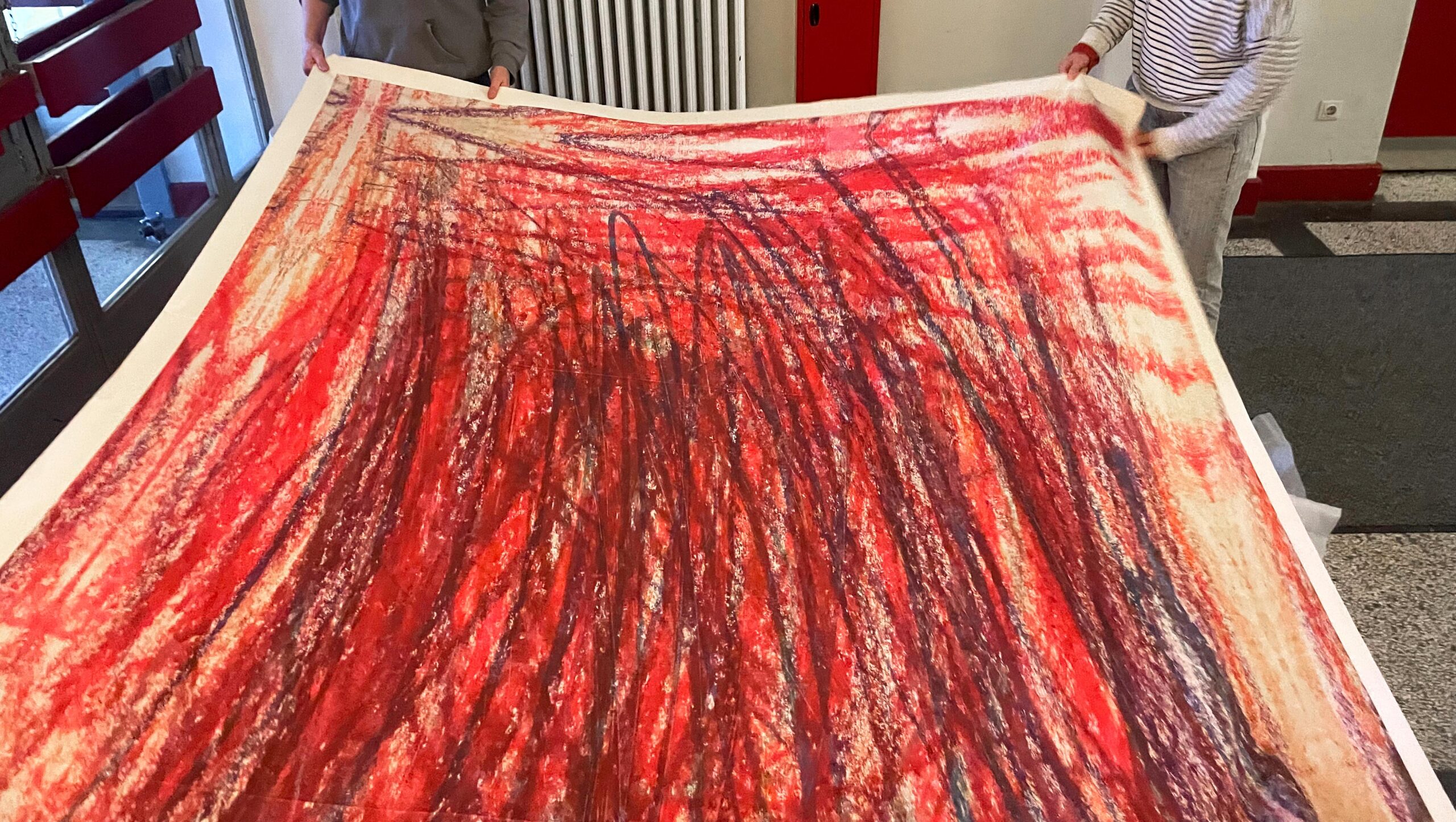 Da der, von den Schüler:innen gewünschte, Teppichboden für die Pädagog:innen schwierig sauber zu halten ist, wird der Entwurf als Wandteppich umgesetzt. Dafür wird das, vom Schüler Mohammed gemalte, Bild vergrößert und auf einen, mit Holzdämmmaterial gefütterten, Rahmen aufgespannt.